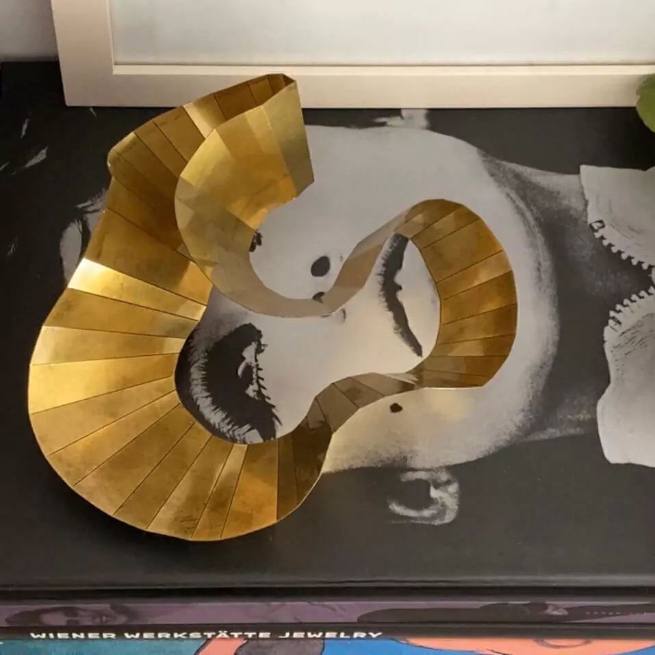 A técnica desenvolvida por Camila Sarpi para dar forma e volume ao metal plano transcendeu a joalheria e ganhou escala, na forma de uma escultura.